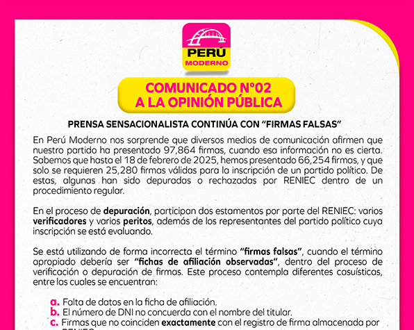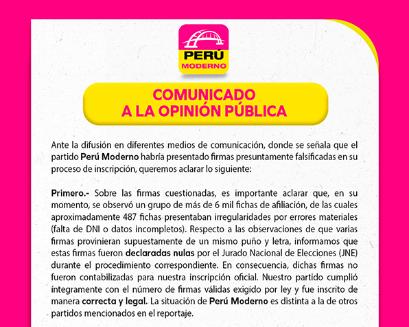 Ante la difusión en diferentes medios de comunicación, donde se señala que el partido Perú Moderno habría presentado firmas presuntamente falsificadas