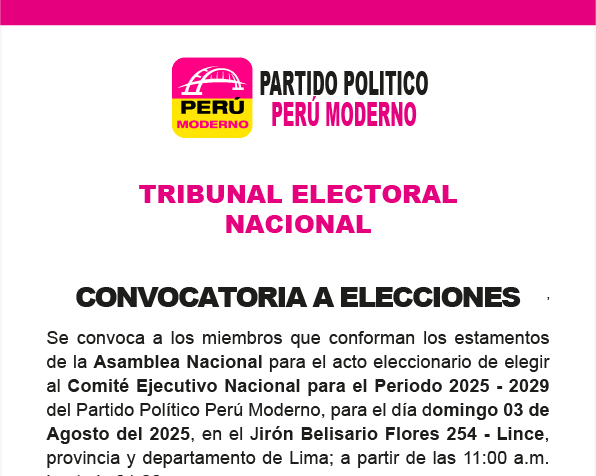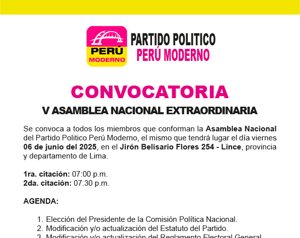 Se convoca a todos los miembros que conforman la Asamblea Nacional del Partido Político Perú Moderno