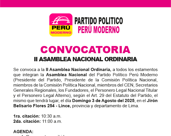 Se convoca a la II Asamblea Nacional Ordinaria, a todos los estamentos que integran la Asamblea Nacional del Partido Político Perú Moderno