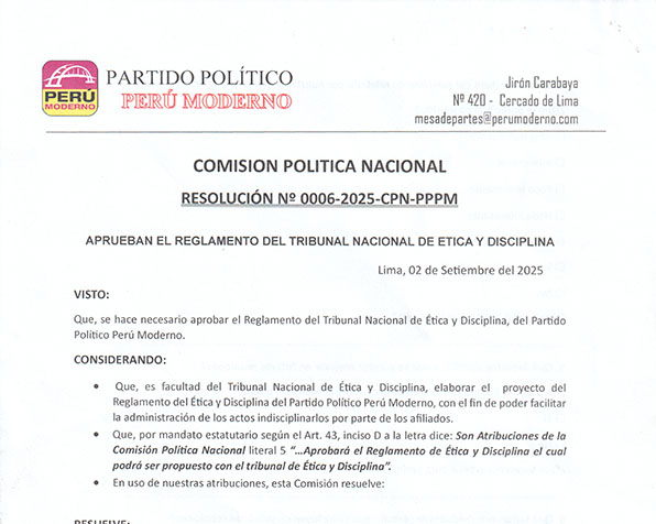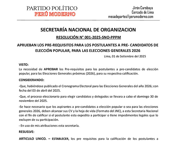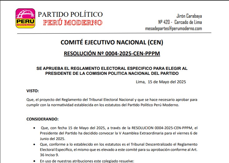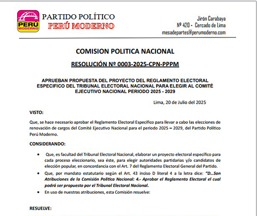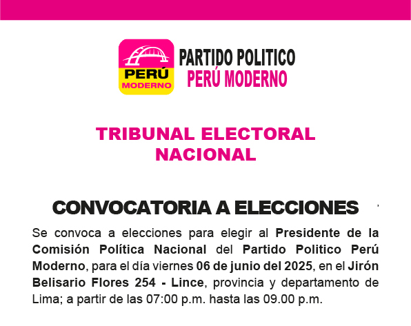 Se convoca a elecciones para elegir al presidente de la Comisión Política Nacional del Partido Político Perú Moderno