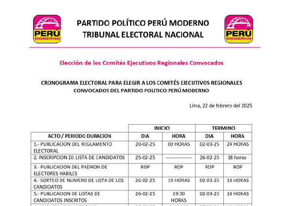 Cronograma electoral para elegir a los Comités Ejecutivos Regionales convocados del partido politico Perú Moderno