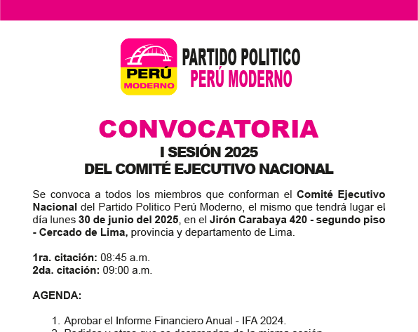 Se convoca a todos los miembros que conforman el Comité Ejecutivo Nacional del Partido Político Perú Moderno